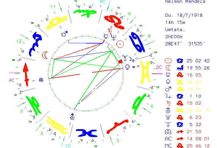 Zuid Afrika, maar wellicht de hele wereld, kan maar moeilijk afscheid nemen van Nelson en deze energie houdt hem nog altijd hier op aarde. Toch is het een feit dat het einde nu nadert. Een en ander is goed te zien in de causale horoscoop van hem. Als er één mens in zijn causale horoscoop, (lees geestelijke horoscoop), geleefd heeft, dan is hij het wel. Nelson Mandela werd geboren op 18 juli 1918 om 14.15 in Umtata Zuid Afrika