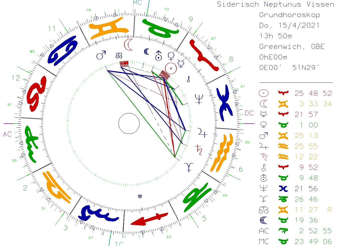 Wanneer je nu kijkt naar de siderische horoscoop van het moment, dan krijg je deze volgende horoscoop: