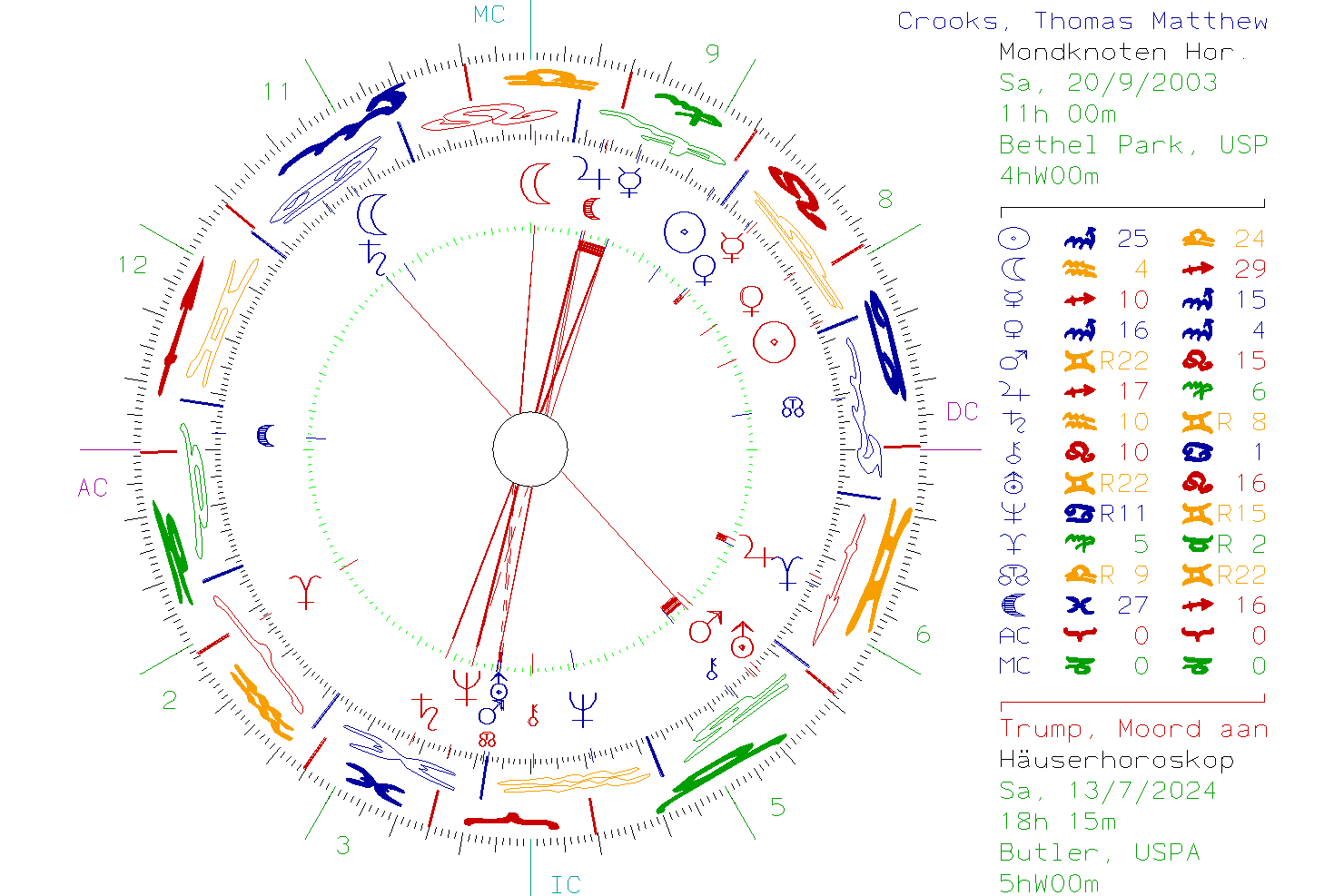 Je ziet nu dat de maansknoop (de ascendant van de moordaanslag en tevens zijn dood) conjunct valt met de Mars/Uranus conjunctie waar dus het leeftijdspunt een verbinding mee maakt. Ook maakt de Saturnus van Crooks (blauw) een oppositie met de Mars/Uranus conjunctie van de aanslag. Met andere woorden: hij voelde een enorme collectieve boosheid en zag het als zijn onbewuste missie om Trump te vermoorden. Ook maakt de Saturnus van Crooks die over oud karma gaat, een oppositie met Mars van zijn dood, die dan weer een conjunctie maakt met Cheiron. Dit alles verwijst naar een herhaling van zetten. Dat dit soort mislukte aanslagen heeft duidelijk te maken met een niet gepakte ontwikkeling van de persoonlijke en collectieve volksziel (Uranus). Of, om Rudolf Steiner aan te halen: in de 21ste eeuw ontstaat er een strijd van allen tegen allen. Dit is nodig om bewust te worden van wat écht sociaal gevoel is.