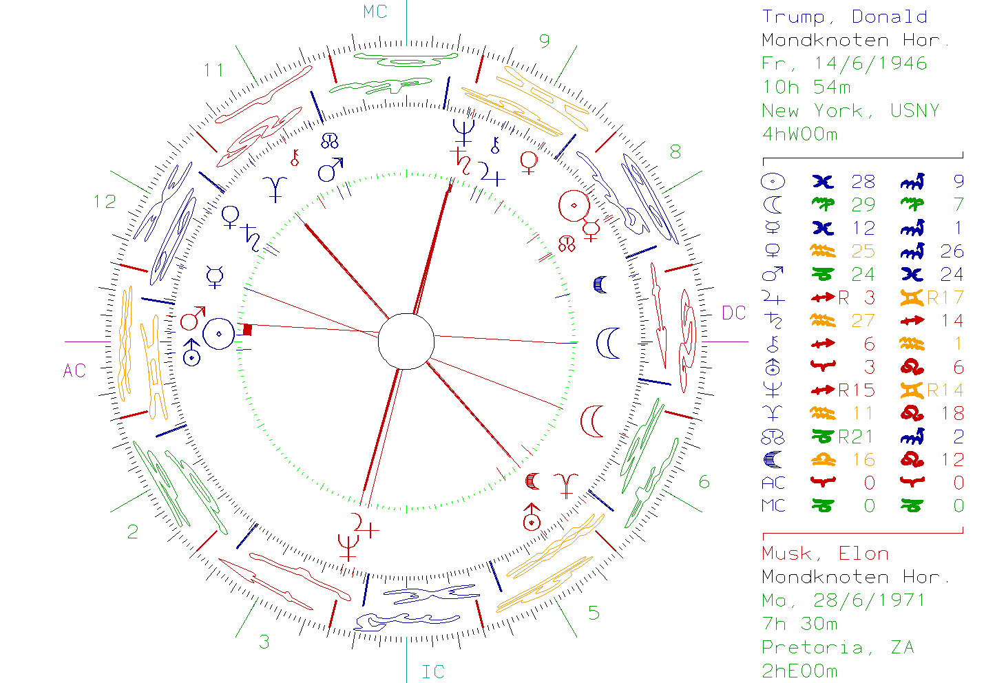 Daar zie je de Mars van Musk (rood) in het twaalfde huis staan conjunct de Zon op de ascendant oppositie de Maan van Trump op de descendant (blauw). Het kan dus zomaar zijn dat deze relatie weer stuk loopt als niet het bewustzijn verruimt wordt.