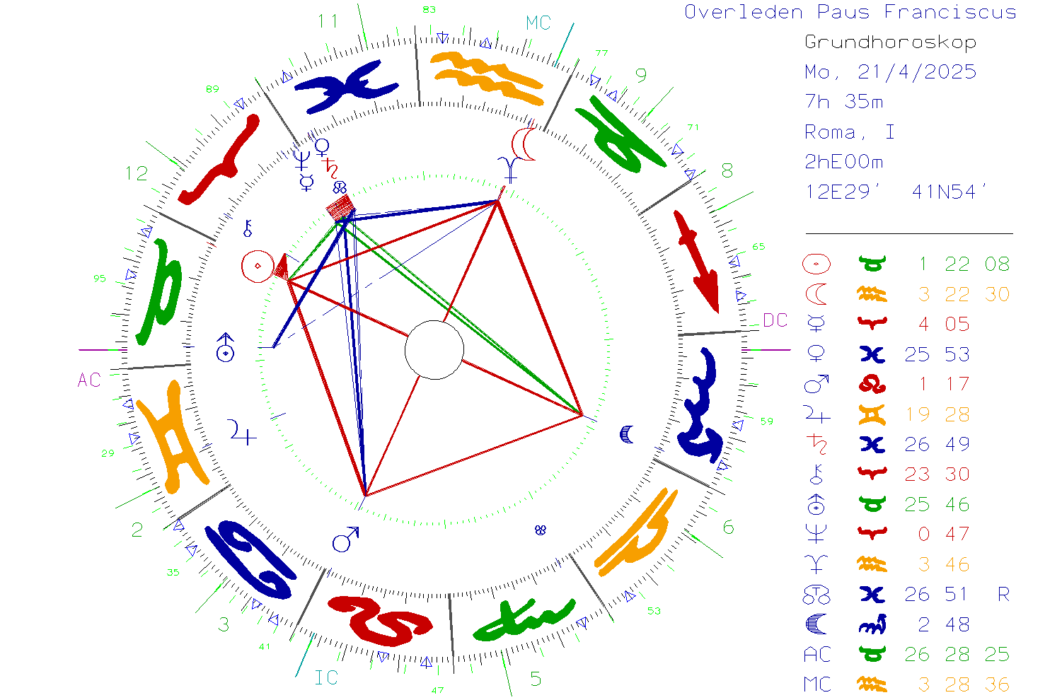 Er valt nog veel van deze horoscoop in combinatie met bijvoorbeeld Franciscus zijn geboortehoroscoop te vertellen; wellicht daar later nog eens over. Wat duidelijk wordt aan dit overlijden is dat de Rooms-Katholieke Kerk evenals ieder hier op aarde zal moeten veranderen omdat een nieuw bewustzijn zijn intrede doet. We herdenken deze Paus als een bijzonder mens die mededogen had met de gewone mens, maar ook met de aarde!